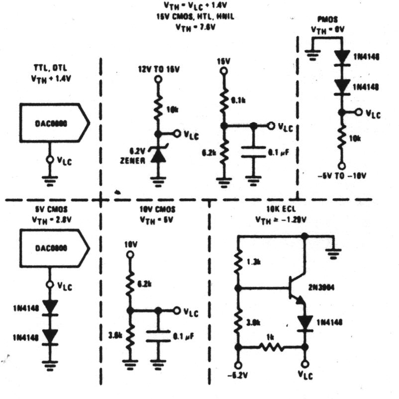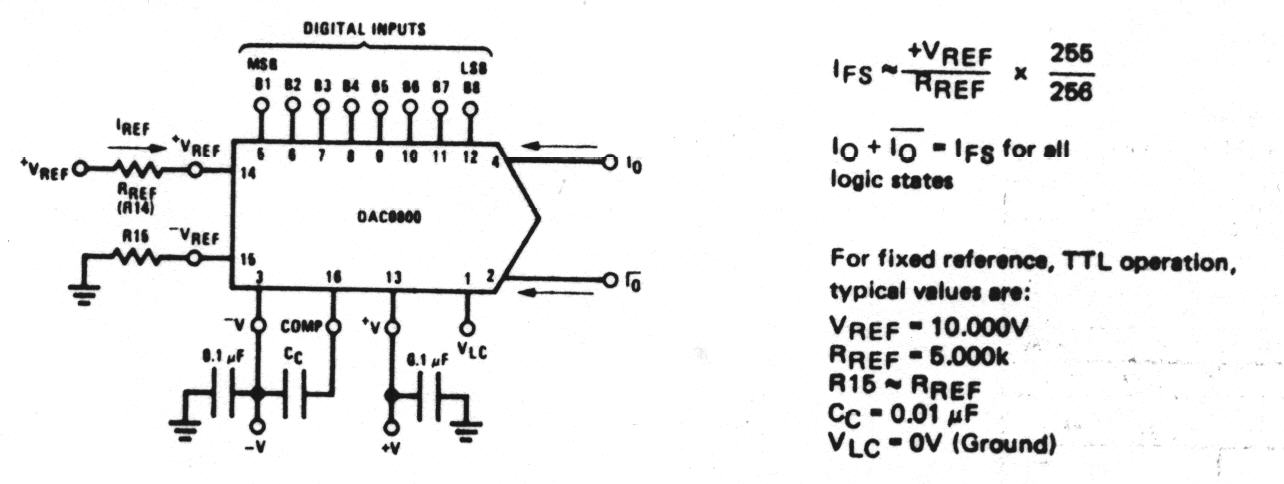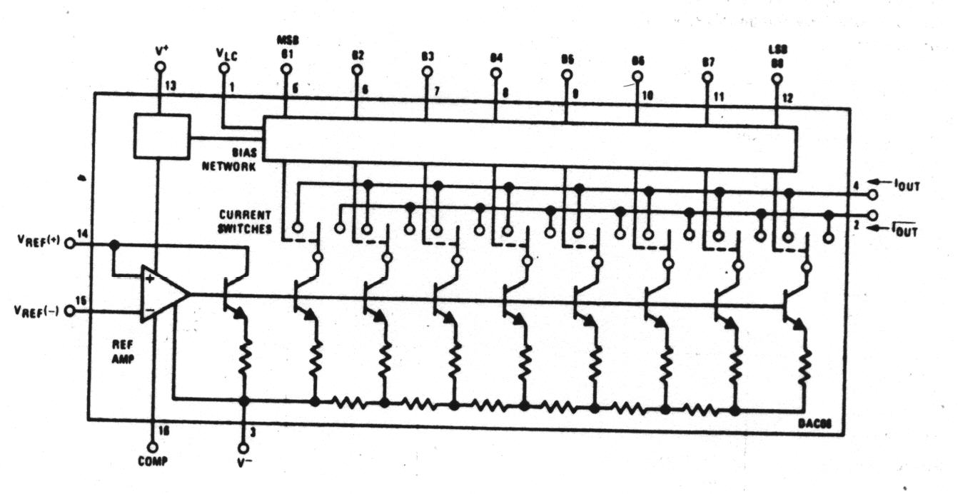 Il DAC 0800 è un convertitore ad 8 bit ad alta velocità che fornisce in uscita una corrente proporzionale al valore digitale di ingresso e alla tensione di riferimento (cioè può anche essere usato come DAC moltiplicatore).