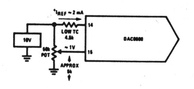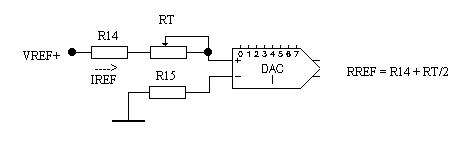 La corrente di riferimento IREF può essere scelta di valore compreso tra 0,2 e 5mA. Al fine di avere la possibilità di regolare la corrente di fondo scala, al posto di RREF, può essere inserita la serie di una resistenza e un trimmer, come in figura.