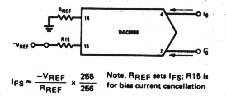 Iniettando una corrente di riferimento IREF (che fisserà la corrente IFS di fondo scala desiderata in uscita) nel terminale VREF(+), l'operazionale interno fissa la tensione di base e le correnti dei transistori disposti secondo una struttura a specchio di corrente (uno specchio di corrente è una struttura integrata che converte la corrente applicata al suo ingresso in una corrente assorbita che sta in un preciso rapporto con la prima). Le correnti di emettitore degli 8 transistori connessi ai deviatori, a causa della rete resistiva R-2R, sono proporzionali al peso binario dei corrispondenti bit di ingresso e valgono, rispettivamente,